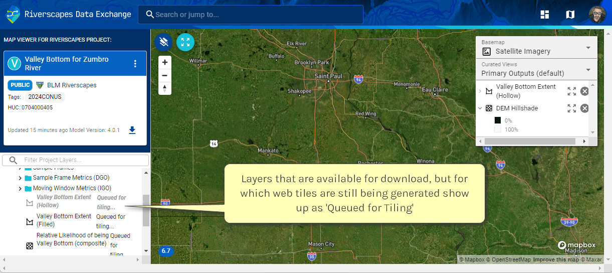 As soon as a Riverscapes Project is successfully uploaded to the Data Exchange, we make it available for download. However, it takes time for the exchange to generate web tiles of all the layer views of that project and make them visible in Web Viewer. Depending on how many new projects have been uploaded recently, this can take hours, days or even a week or more.